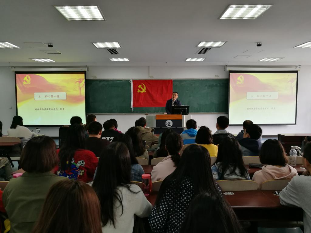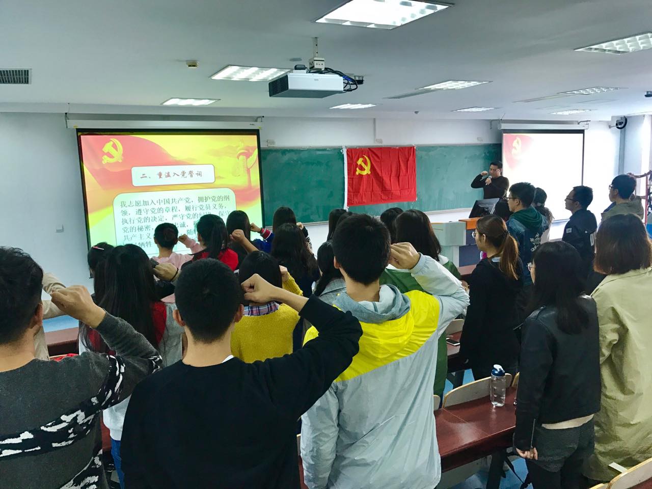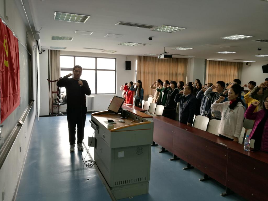 2017年10月17日上午,为迎接党的十九大胜利召开,财政税务学院2017级硕士研究生4个党支部在沙河西区403教室联合举办了主题为“争做先锋党员,重温入党誓词”的主题党日活动,参加此次活动的有学院党委书记樊勇老师,组织员李飞霞老师,宣传委员庞淑芬老师以及2017级全体研究生党员。