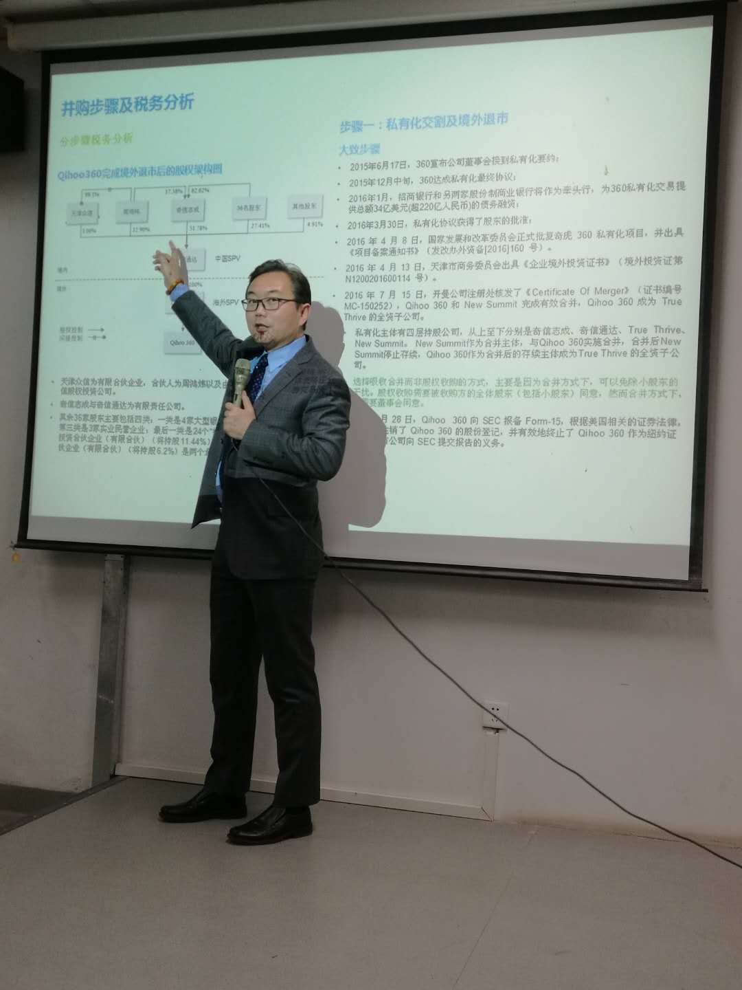 宋老师在如何拆红筹架构中为同学们介绍了其难点——是应采取低作价倾向于创始人还是应按市场价值倾向于投资人?也就是说难以确定一个作价可以兼顾创始人和海外投资人的利益。通过以上知识的铺垫,宋老师为同学们讲解了360海外退市A股借壳上市的案例。奇虎360通过VIE架构在美国上市,完成私有化一系列内部重组后,最终通过借壳江南嘉捷回归A股。360并购主要分为五个步骤:私有化交割和境外退市、拟上市部分业务调整、借壳交易标的公司的形成、江南嘉捷“净壳”——资产出售及置换、江南嘉捷发行股份购买360资产。