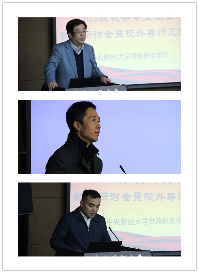 校外导师在会上纷纷发言,为中财税务专硕的培养献计献策。北京智方圆税务师事务所有限公司总裁王冬生先生,充分肯定了中财学子学术综合素质,并对同学们提出了几点建议,第一是提高写作能力,第二是提高哲学水平,要善于辩证思维。北京鑫税广通税务师事务所有限公司董事长王进先生指出,2019-2020年国家将要建立1000家税务师事务所与高校的校企实习基地,希望能继续与中财税务专业加强合作。德勤会计师事务所合伙人宫滨先生在会上对同学们提出几点希望,一是在学习过程中多去关注思路与方法,多去接触税务的方方面面。二是把握好两年的时间,积极参与学习、实践、实习等,一定要锻炼同时处理多个任务的能力,三是时刻注重对自己的管理,无论毕业后走向哪里,都要接受社会的考验。北京市国税局第二稽查局孔丹阳副局长也对同学们提出几点建议:一要注重课程学习;二要多学科融合学习,努力成为复合型人才。尤尼泰税务师事务所董事局主席刘志忠先生提出,税务行业用自己的智慧做出贡献,同学们毕业后进入这个行业将会在工作中不断提升自己的能力,获得更好地发展。普华永道会计师事务所合伙人钱江涛先生认为,不管以后从事什么行业,最重要的是对个人能力的培养,用自我驱动力去学习了解更多的东西。德勤会计师事务所税务经理李权周先生以自己在税务局工作的经历与同学们共勉,表示将继续为同学们的实习实践提供机会。德勤会计师事务所税务经理嵇峰先生用自己的亲身经历描绘了从事税务行业的苦与乐,建议同学们根据自己的兴趣在税务服务里选择最适合自己的领域。乾元中利国际税务咨询(北京)有限公司副总经理燕东先生认为,大家在学校除了学习工作外要思考的东西,多涉猎,多思考。华夏幸福基业股份有限公司财务部负责人许军先生从职业发展的角度跟同学们交流了上市公司和社会需要什么样的人才,希望同学们能学有所用。
