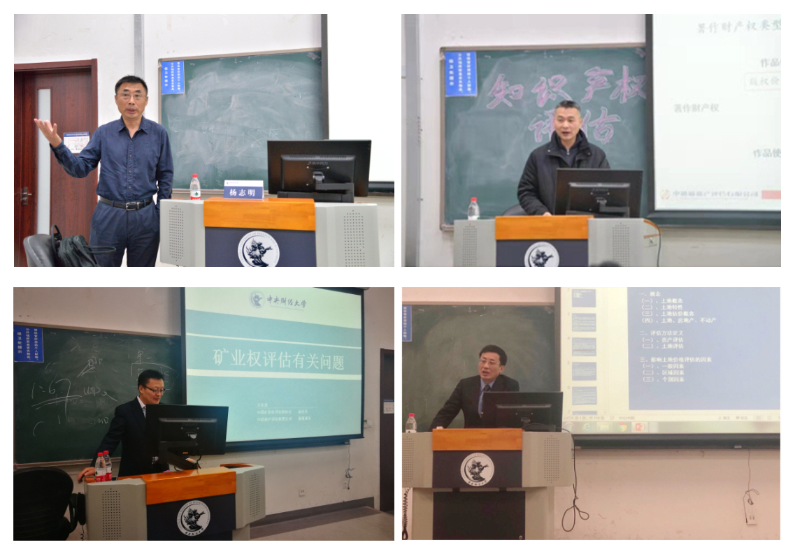 中和资产评估有限公司董事长杨志明先生围绕着机器设备的概念、机器设备相关理论、业务领域和机器设备评估实务四个方面进行了相关介绍;中通诚资产评估有限公司副总裁袁煌先生给同学们讲述了关于知识产权评估的相关知识,从评估对象的特点及识别、资产清查及评估方法和收益法的应用案例三个角度全方位地展现了知识产权评估的过程;中联资产评估集团有限公司高级合伙人、高级副总裁王生龙先生为同学们讲解了中国矿业权评估的起源、发展以及评估实务的操作过程,着重给大家介绍了矿业权评估中的相关概念,提高了同学们对矿业权评估的认识;北京中地华夏土地房地产评估有限公司总裁周维纾先生,从土地估价的特征与要点出发,结合自身的经历和案例,详细地讲解了国企改制中土地评估的处置工作,丰富了同学们关于土地估价的实务知识。