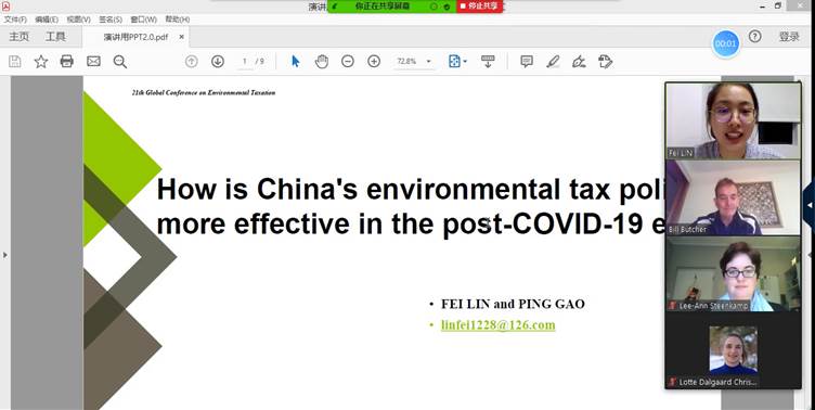 林菲同学在分论坛上发表了题为“Howis China's environmental tax policy more effective in the post-COVID-19 era?”的演讲。林菲同学介绍了新冠肺炎疫情对我国经济、环境和社会等方面的影响,讨论了疫情期间我国环境税收政策对税收优惠和征管方面做出的改进和创新,重点探讨了我国在“无接触式”办税新形式和危险废物的税收优惠政策等方面的进展和有益经验,并指出在后疫情时代,中国税负上调空间可能受限,环境税收政策实施应更注重运用现代税收征管方式,实现征管效率的提高,进一步完善危险废物的环境税收政策以及医疗废物资源综合利用政策等。这一主题引起了与会者的广泛关注,来自南非、意大利、西班牙等国的学者积极围绕林菲同学的发言展开讨论,并深入交换了学术观点。在全球疫情仍然严峻的当下,我院师生紧扣全球新冠疫情严峻背景,把握疫情期间我国环境税收政策实际,重点介绍并探讨了后疫情时代我国环境税收的有效性问题,这有助于增进其他国家对我国环境税收政策的了解,也有助于我院师生了解国际环境税收研究的前沿方向。