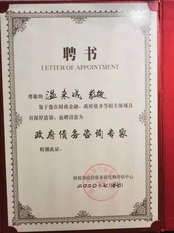 经学校推荐,财政部有关方面批准,财政部政府债务研究和评估中心向我校财税学院教授、博士生导师、中财-中证鹏元地方财政投融资研究所执行所长温来成颁发了政府债务咨询专家聘书。温来成教授长期从事地方政府债务等财政投融资教学研究工作。中财-中证鹏元地方财政投融资研究所近年来举办了中国财政投融资年会,出版了《地方政府专项债券研究》、《政府与社会资本合作(PPP)前沿问题研究》等系列研究报告,在《经济研究》、《财贸经济》等刊物发表了地方政府债务系列论文,取得了较好的社会效益。