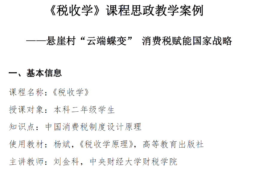 为深入贯彻习近平总书记在全国高校思想政治工作会议重要讲话精神,落实《教育部关于印发<高等学校课程思政建设指导纲要>的通知》(教高[2020]3号),全面推进财政学类专业课程思政建设,财政学教指委面向全国高校征集财政学类专业课程思政优秀教学案例。截止2022年4月30日,共收到38所高校提交的94个案例。经专家组初审、复审和会议评审,共评选出一等奖10个,二等奖15个,三等奖21个。其中,我院副院长何杨教授的教学案例《聚财为国 守土有责》荣获一等奖,刘金科副院长的《悬崖村“云端蝶变” 消费税赋能国家战略》荣获三等奖。
