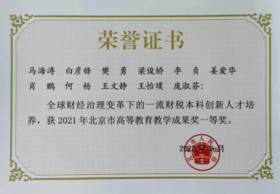近日,学校召开了2022年度本科教学获奖颁奖大会。我院马海涛教授团队的“全球财经治理变革下的一流财税本科创新人才培养”获得2021年北京市高等教育教学成果奖一等奖。