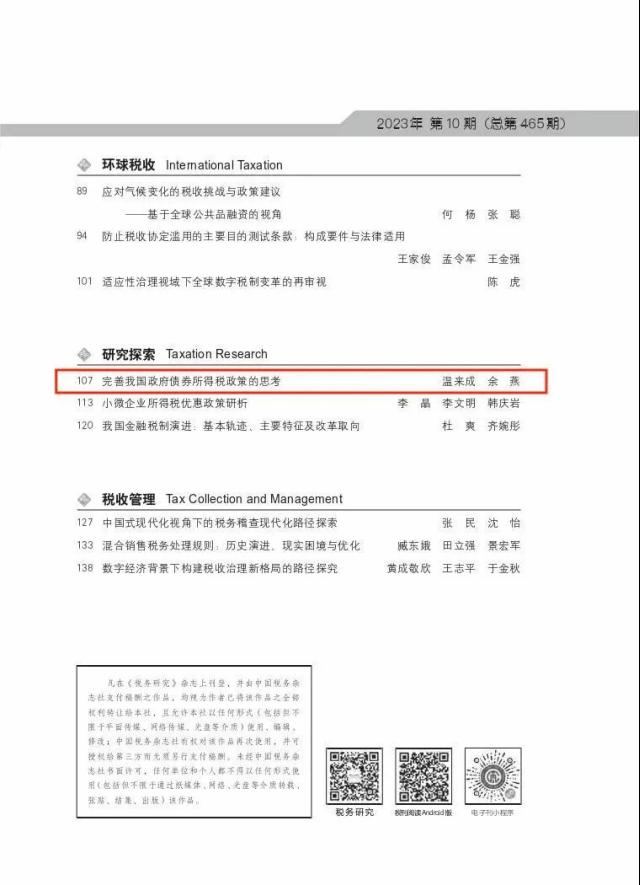 近日,由中央财经大学中财-安融地方财政投融资研究所执行所长、亚美在线登录教授温来成和亚美在线登录博士研究生余燕撰写的论文《完善我国政府债券所得税政策的思考》刊发于中文A类期刊《税务研究》2023年第10期。以下为文章主要内容: