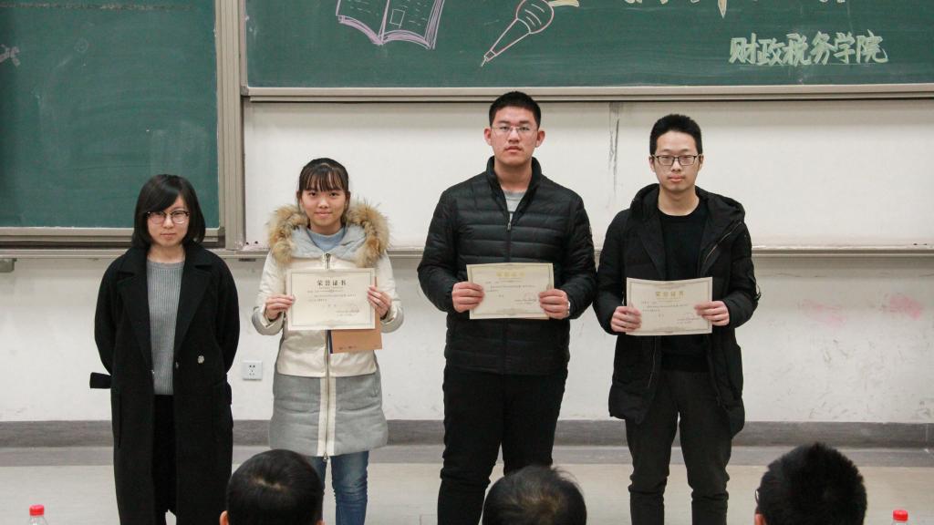 与此同时,演讲比赛的评分结果出炉,国税15的王舒柳同学获得一等奖,财政学类17-6班的瞿诗琦和刘天颀同学获得二等奖,财政15-2班的曹颖同学、财政学类17-2班任太荣同学、财政学类17-4班黄楚君同学获得三等奖,由党委副书记宋立岩老师为大家颁奖。紧接着,读书大赛优秀团队及个人、朗诵大赛、最美书评活动也依次进行了颁奖,葛岩老师,刘明老师,于来老师,寇恩惠老师,陈颖老师,徐燕妮老师依次上台为大家颁奖。