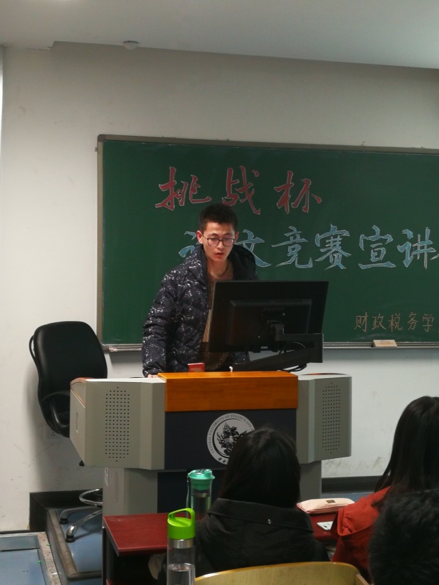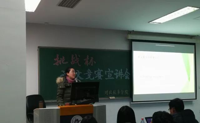 11月30日下午6点半,在西区505教室迎来了财政税务学院“挑战杯”论文大赛宣讲会,本场讲座由王凯旋同学主持,讲座邀请到的嘉宾有王文静、寇恩惠两位老师。学术实践部部长鲍梦蓓和副部长董士萍出席本次活动,各个年级的同学都参与其中。