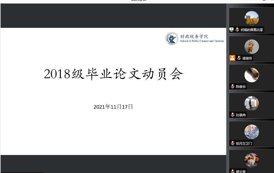 11月17日下午,亚美在线登录2022届毕业生毕业论文动员大会通过“腾讯会议”以线上会议的形式顺利举行。此次会议的主要目的是向2022届本科毕业生介绍毕业论文相关事宜、大致时间安排、基本流程,让毕业生了解毕业论文的重要意义,准确把握学术论文规范、合理安排论文进度。参加本次会议的有副院长何杨教授、财政管理系孙景冉老师、资产评估系彭章老师、学院教学科研办公室庞淑芬老师以及2018级的全体本科生。此次会议由何杨副院长主持。