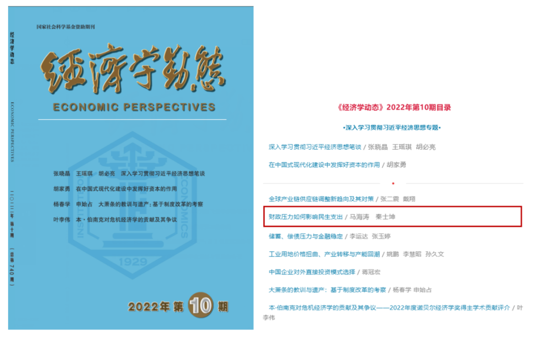近日,由中央财经大学党委副书记、副校长马海涛教授、中国财政发展协同创新中心博士生秦士坤撰写的论文《财政压力如何影响民生支出》在我校A类学术期刊《经济学动态》2022年第10期正式刊发。