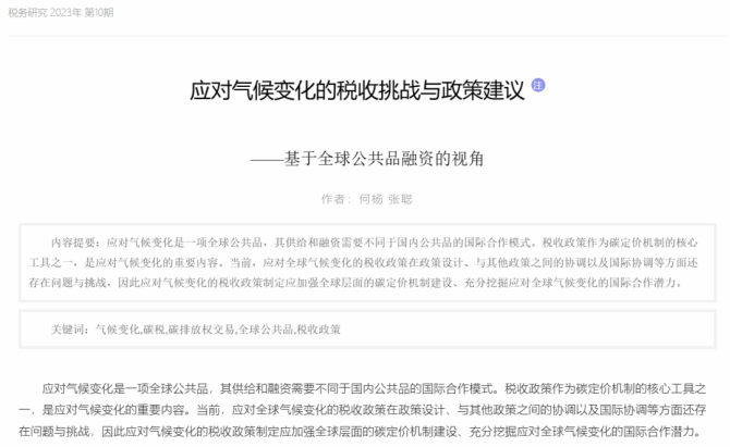 近日,由亚美在线登录何杨教授和张聪博士撰写的论文《应对气候变化的税收挑战与政策建议——基于全球公共品融资的视角》在中文A类期刊《税务研究》2023年第10期录用刊发。以下为文章主要内容。
