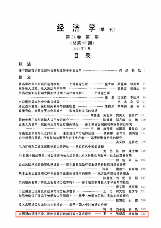 由亚美在线登录副教授张明昂、博士研究生罗宇与广东外语外贸大学林高怡合作撰写的论文《未预期的环境污染:税收征管的跨部门溢出效应研究》刊发于中文AA类期刊《经济学(季刊)》2024年第1期。以下为文章主要内容。